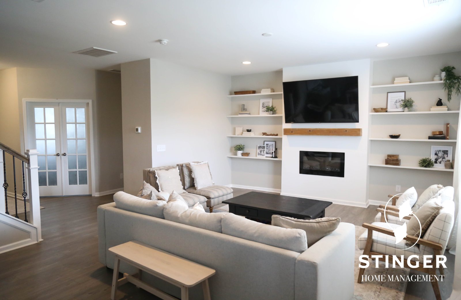- Spacious living room featuring a fireplace and beautiful built-ins for an elevated touch