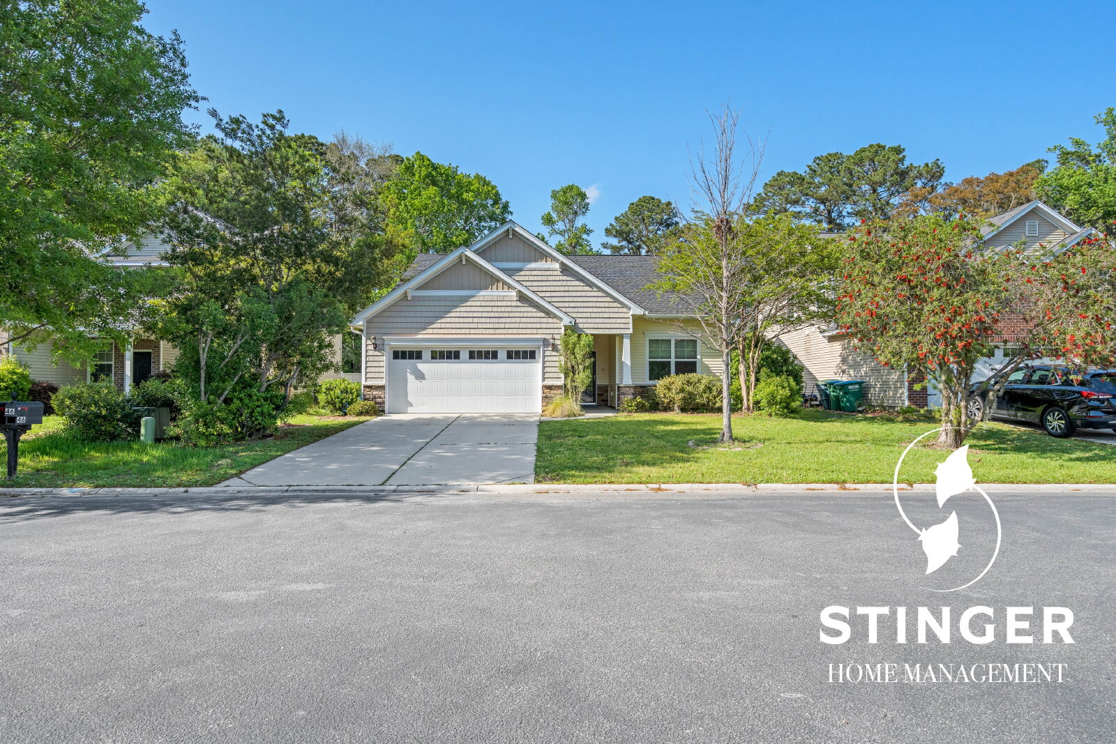 - Attached two-car garage with a large driveway