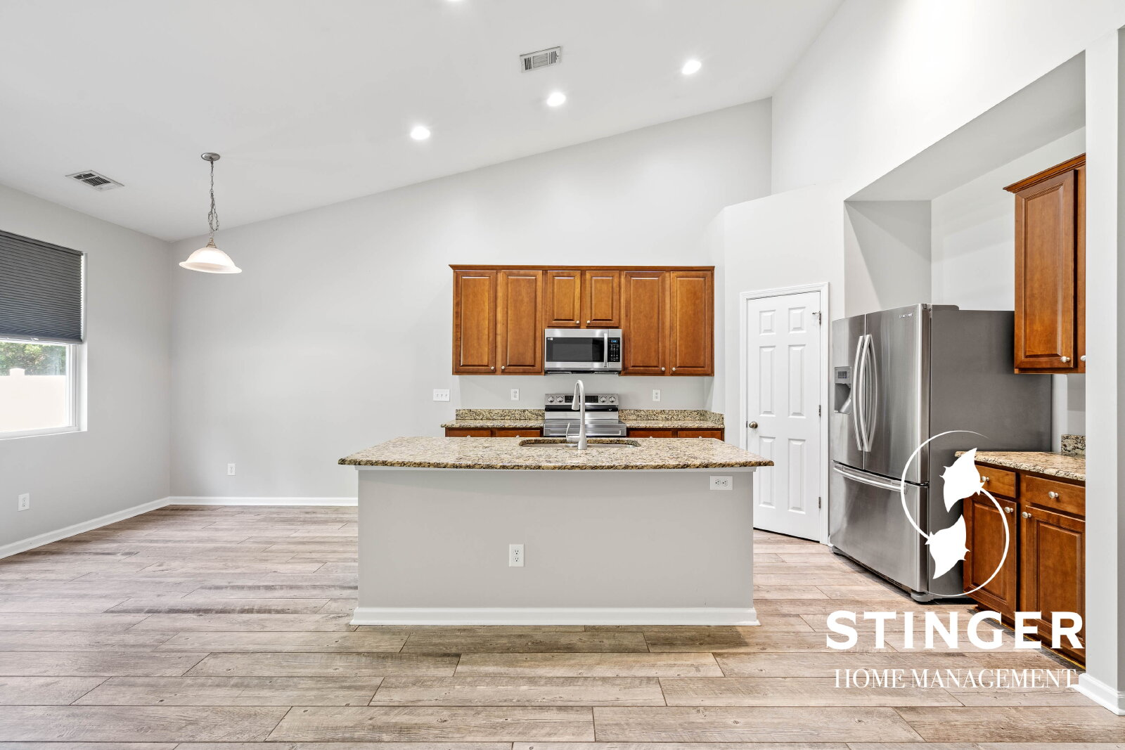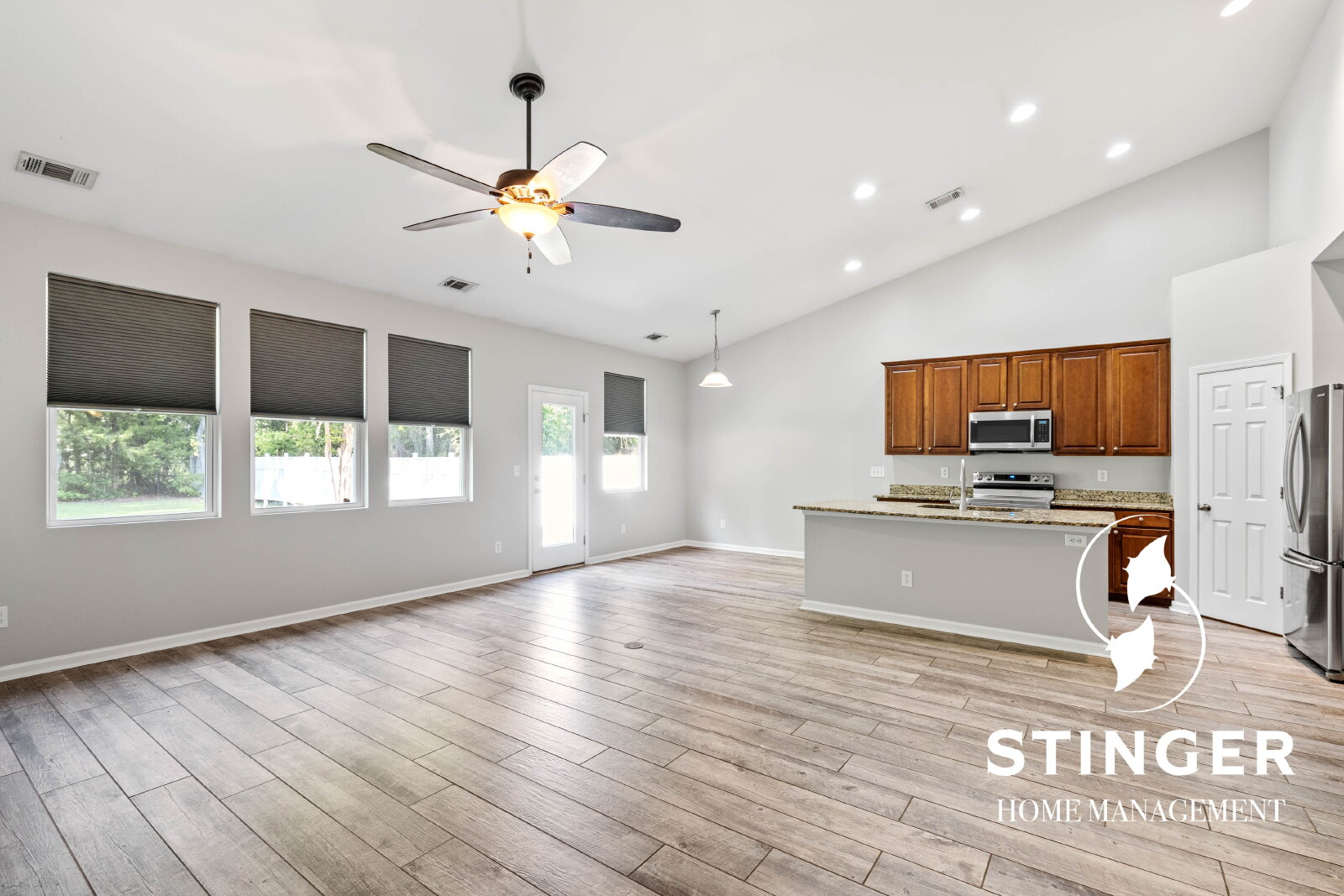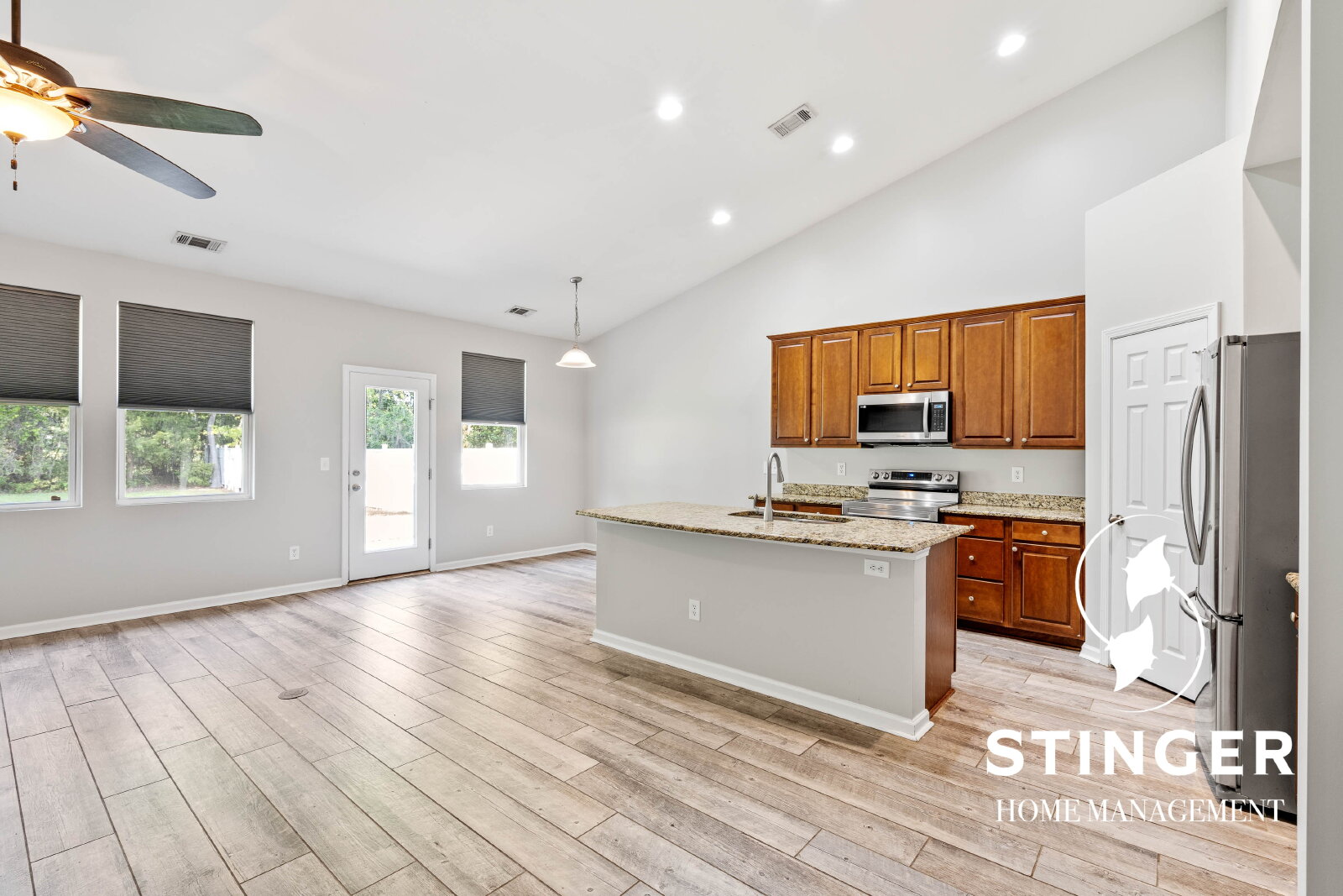 - Open-concept floor plan with vaulted ceilings in the kitchen and living area