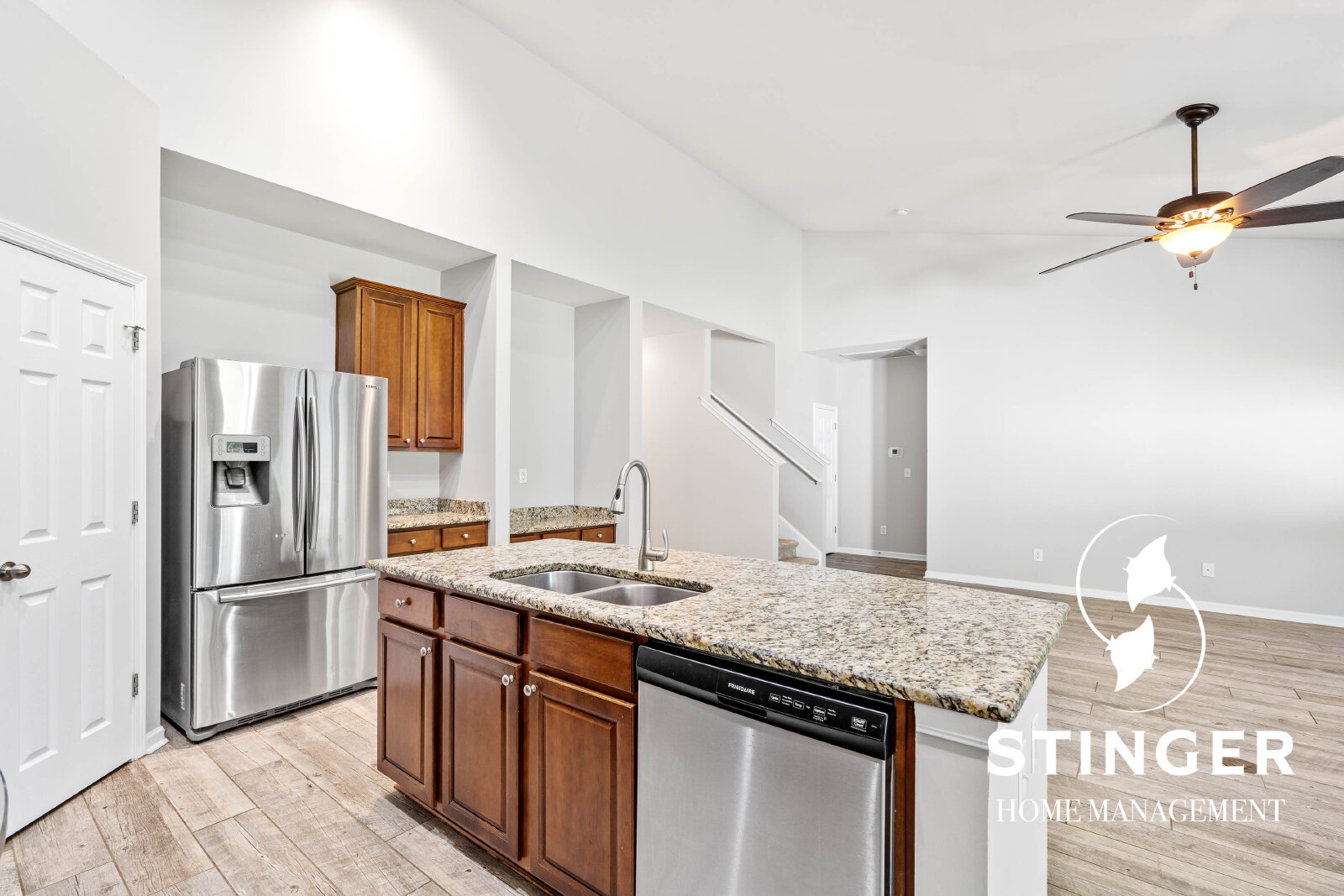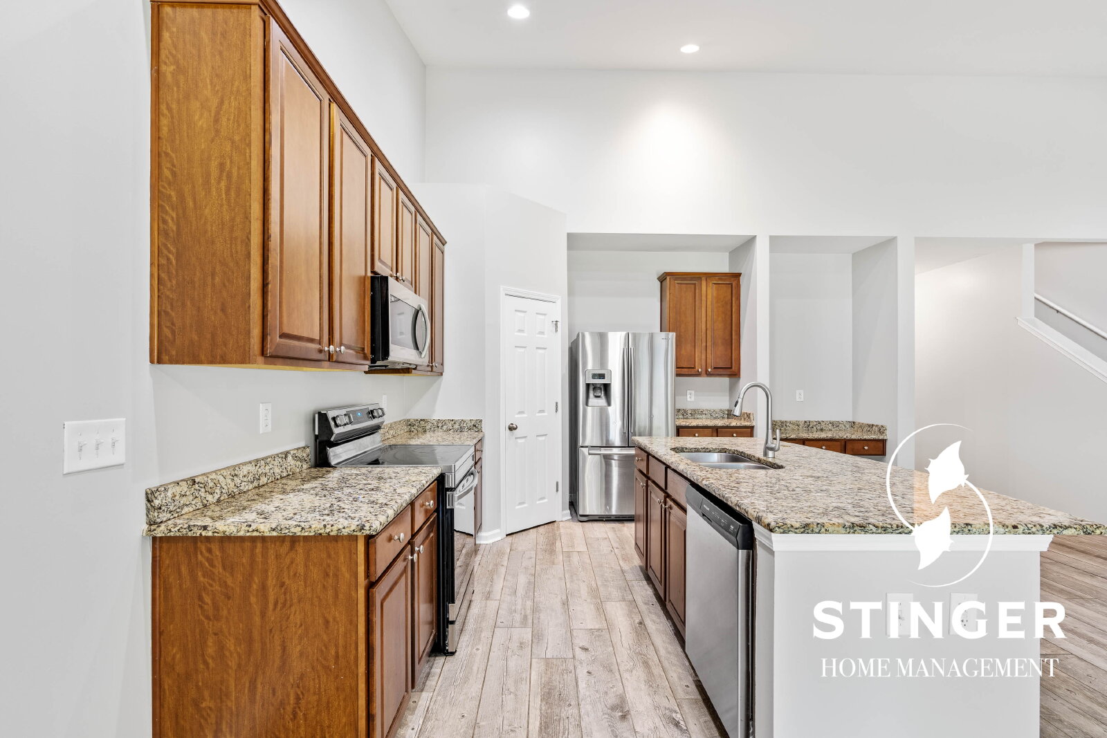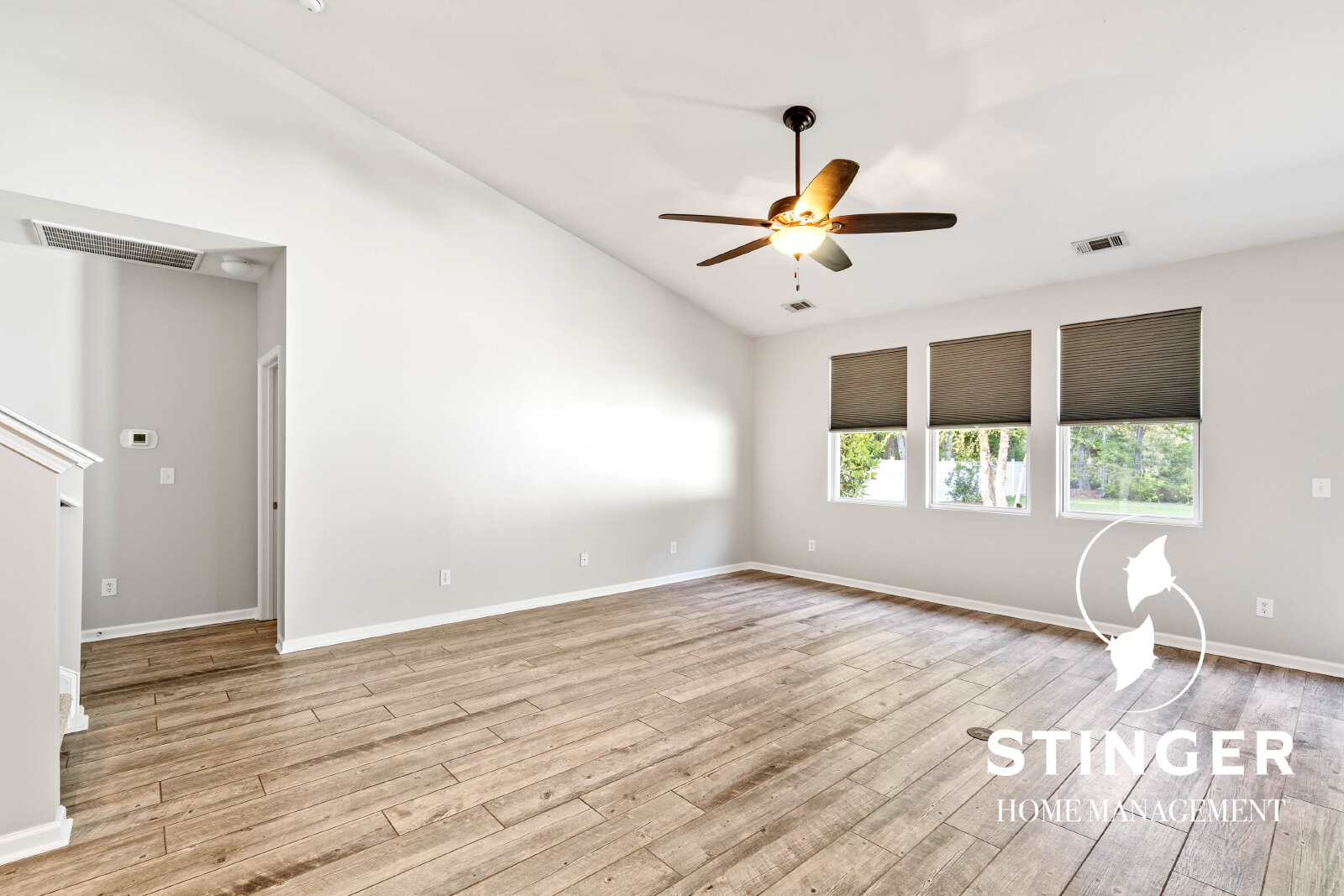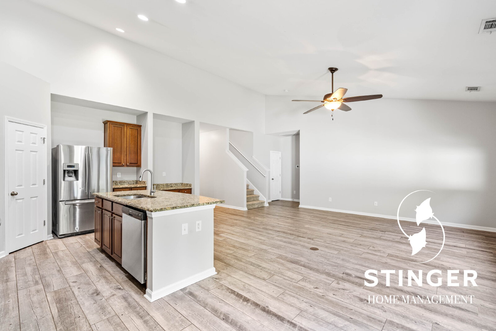 - Open-concept floor plan with vaulted ceilings in the kitchen and living area