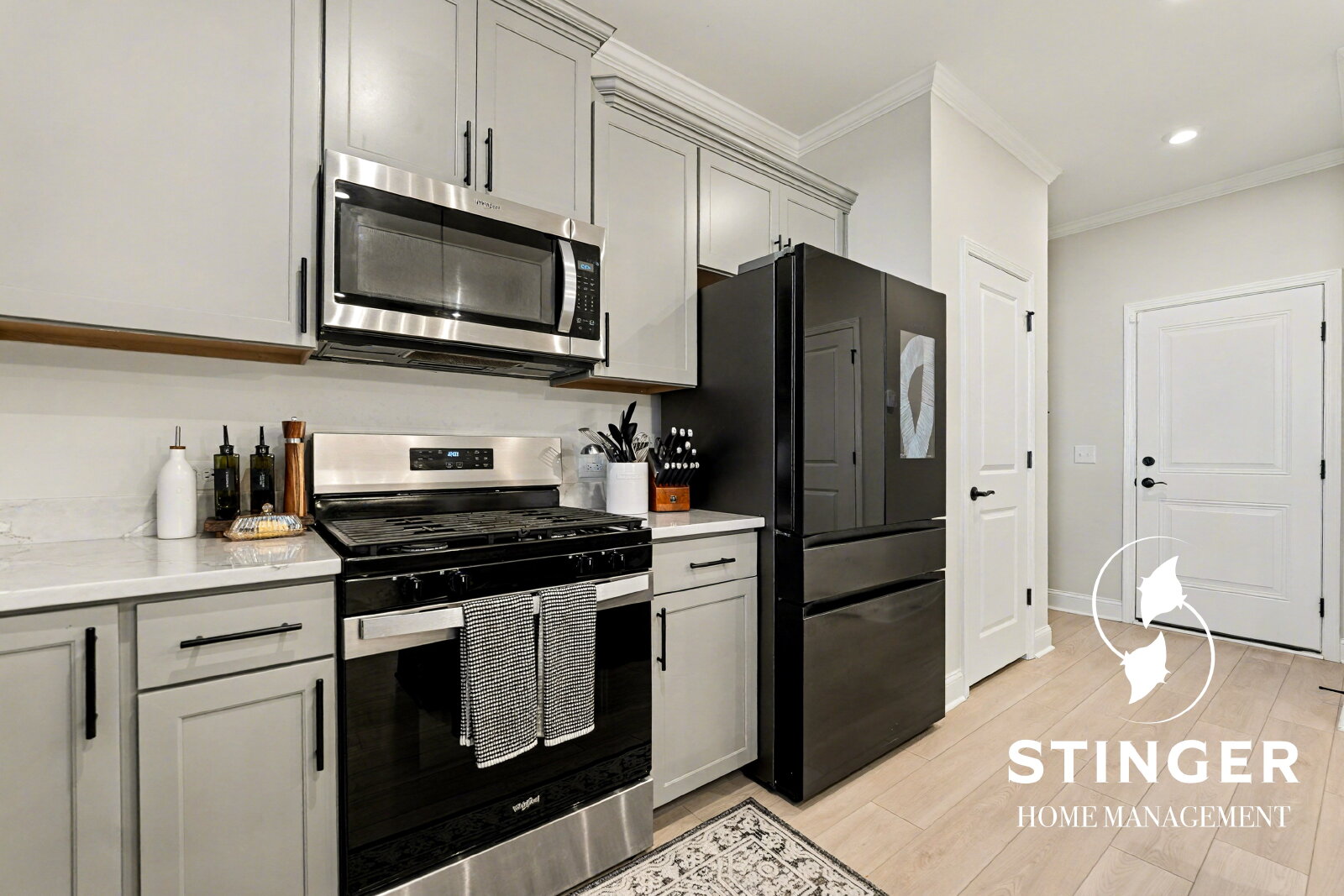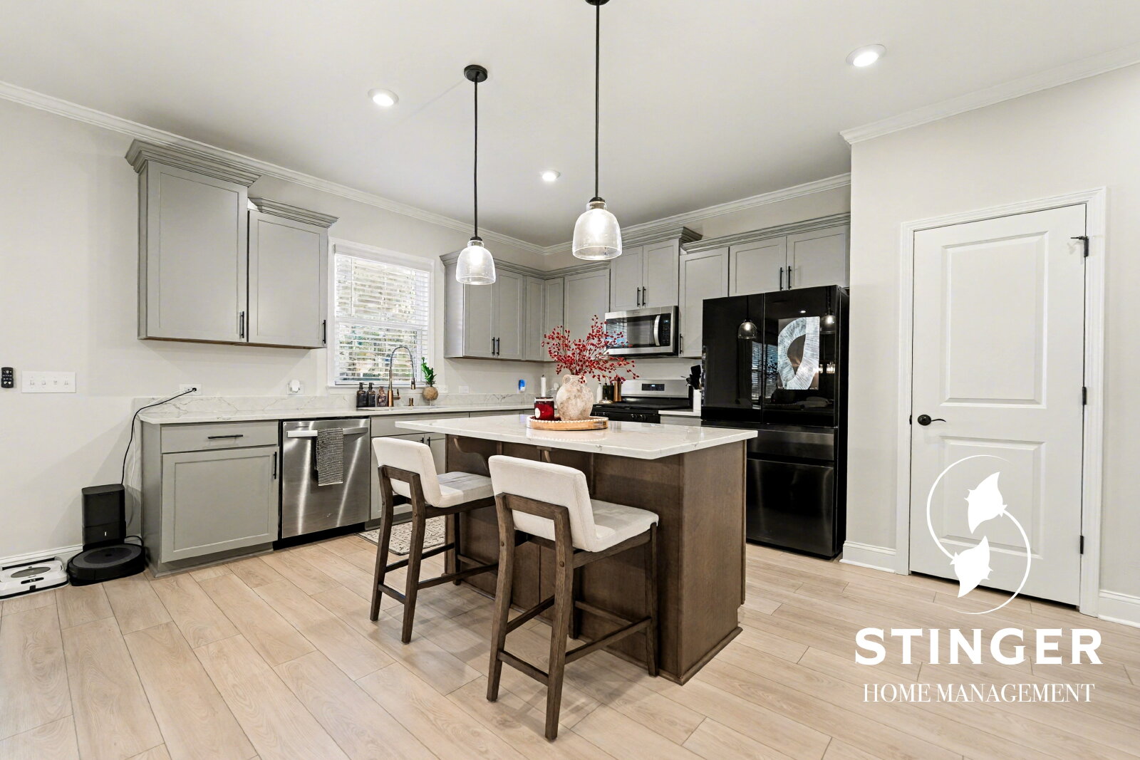 - Stunning kitchen featuring upgraded appliances, a large island, and a walk-in pantry