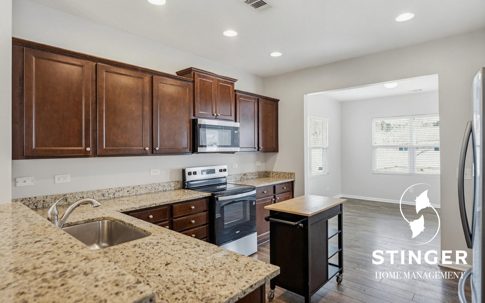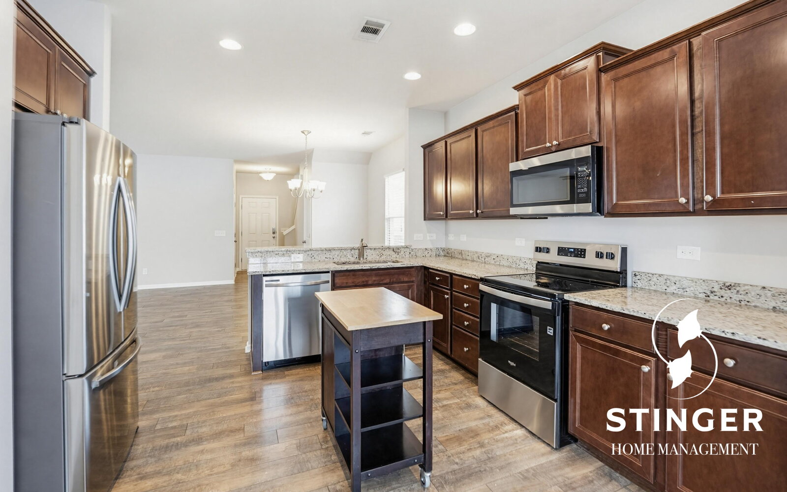 - The kitchen comes fully equipped with standard appliances, a convenient island for additional prep space, and a pantry for extra storage.