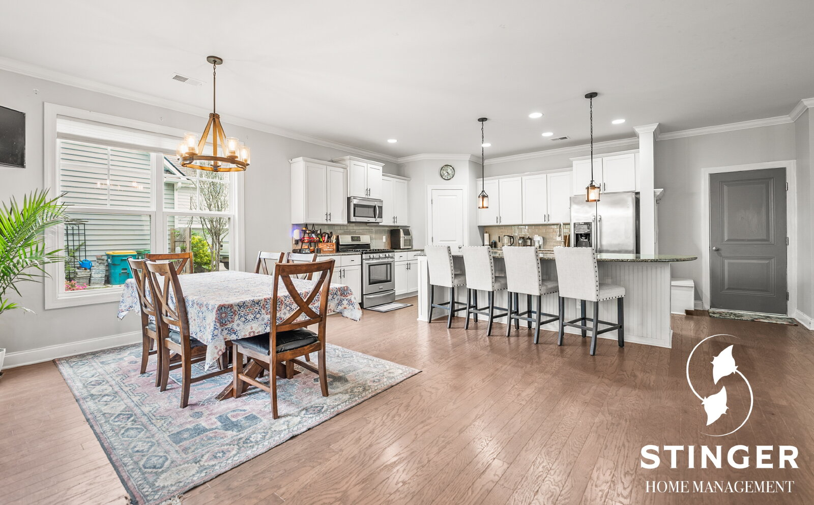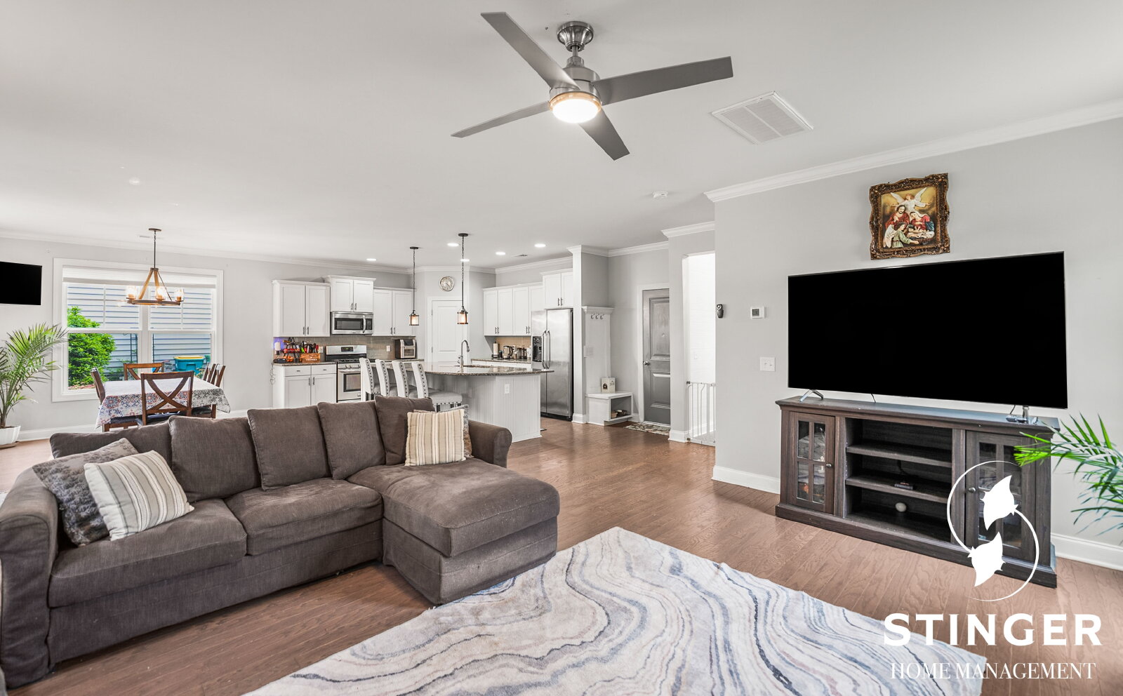 - Open floor plan that seamlessly connects the living room, dining area, and kitchen