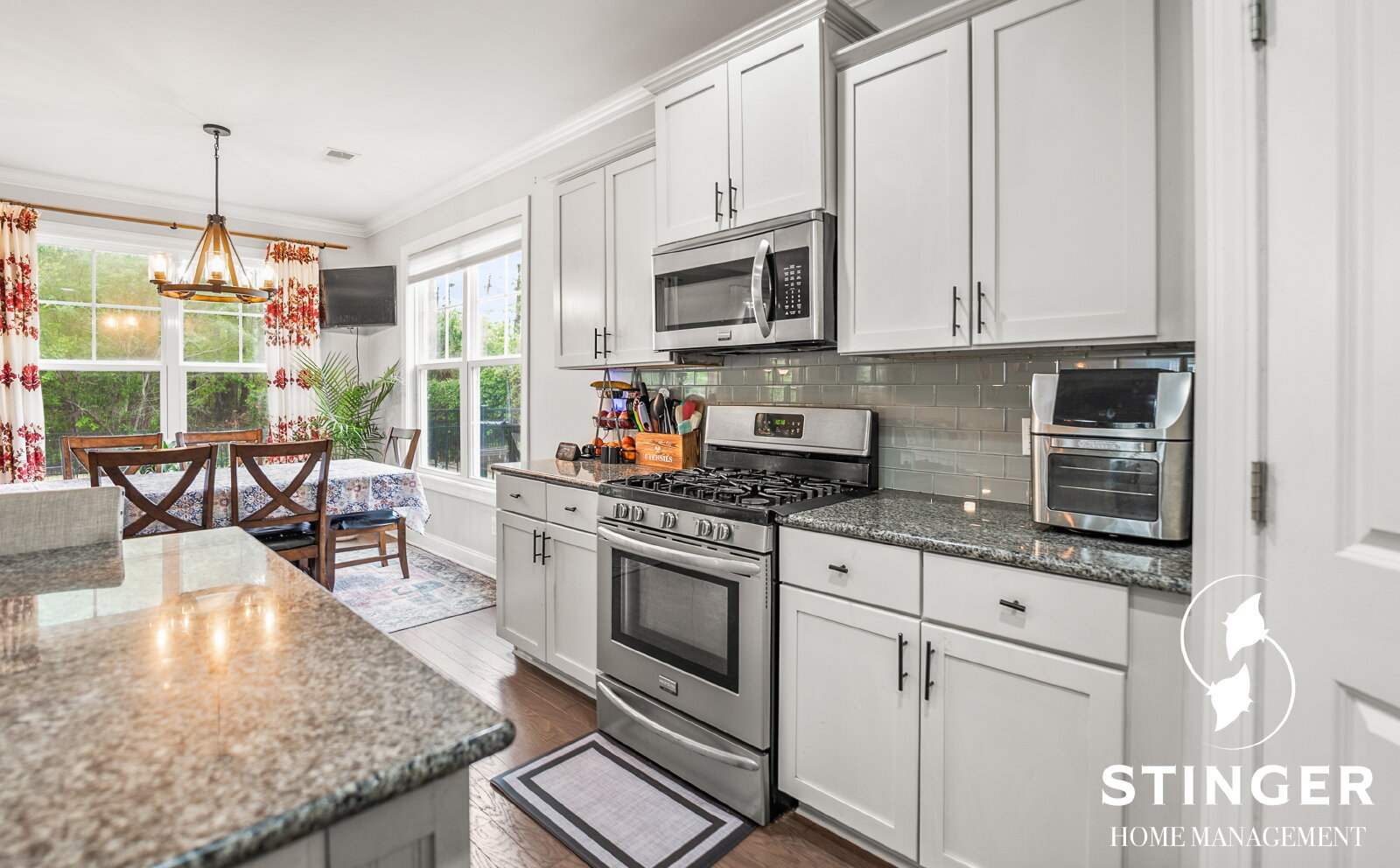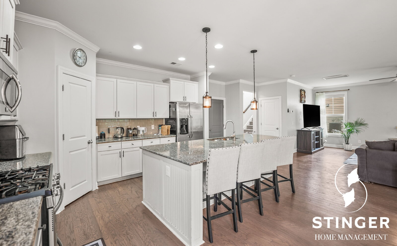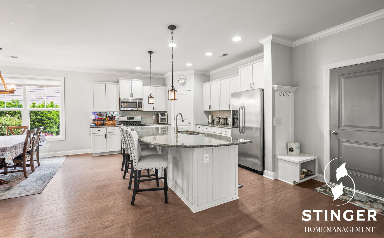 - Kitchen features stainless steel appliances, a cozy island with additional seating, and a spacious pantry